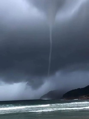 Uma tromba d’água foi registrada na manhã deste domingo (4) na região da Praia de Martinho de Sá, em Paraty. O fenômeno chamou a atenção de moradores e visitantes e foi registrado em vídeos que circulam nas redes sociais. De acordo com relatos, a tromba d’água permaneceu visível por cerca de dois minutos e se dissipou rapidamente após perder contato com a superfície do mar.